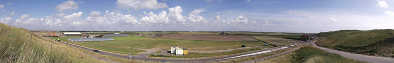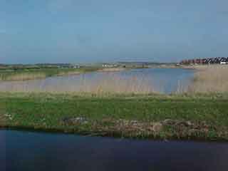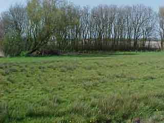| 6. Loop iets voorbij het stenen gebouwtje tot je niet verder kunt. Naar voren en naar links ligt de BoskerPolder. Reeds in 1200 was dit gebied bekend als Boswiel. Kijk eens goed naar de sloot en de dijk waar U op staat. Aan de lussen in de dijken en de wetenschap dat hier in 1570/1573 de zee door de dijken van t' Oghe brak geeft aan hoe de mensen hier hebben gewerkt om het land weer droog te krijgen. Dit gebied is het laagst gelegen deel van de polders rond Callantsoog en had vroeger, iets naar links, een molenkolk waar het boezemwater rond Callantsoog heen stroomde en door molens over de rechtendijk (staat U op) in de molenkolk werd gemalen. |