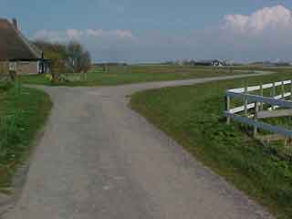 Abbestee. Ga hier naar rechts. De Abbestee is een oud buurtschap dat rond 1600 en 1700 veel groter was dan het huidige Callantsoog. Noordwaarts van de Abbestee ligt deze oude weg. Deze weg is een dijk, die rond 1500 de Oudendijk werd genoemd en weer later de Rechtendijk. Volgens de historicus J Westenberg is deze dijk de Oostgrens van het vroegere eiland 't Oghe. De weg gaat hier in een halve maan over rechts, van de zee af. Vroeger werden gaten in dijken gedicht door een nieuwe dijk zeewaarts of landwaarts te bouwen. |