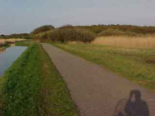 3. Op het laagste punt aangekomen sta je boven op een dam over een sloot. De weg waar je nu op staat is een in 1620 aangelegde dijk of dam welke de doorgebroken zee tegen hield.