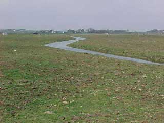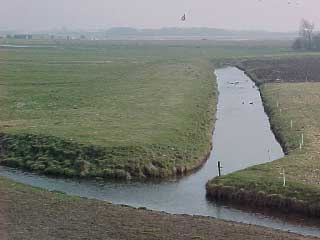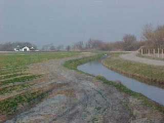 4a Als je langs het witte huisje in de verte (vorige foto) zou kunnen lopen zie je het volgende landschap. Dit landschap is te bereiken door om te lopen, via de Oosterweg en het pad van een bollenboer te volgen. Dit is grasland wat nog niet is verkaveld tot een doelmatige voor machines geschikt weiland. In feite zijn dit nog originele waddengronden zoals die in 1573 zijn overstroomd. De kromme sloot (Foto) herinnert aan een ontwatering zoals die op de waddenzee zijn te zien. Dit is de meest NoordOostelijke kant van het oude eiland 't Oghe uit 1570. Het patroon van dijken en sloten is nog duidelijk herkenbaar in het landschap |